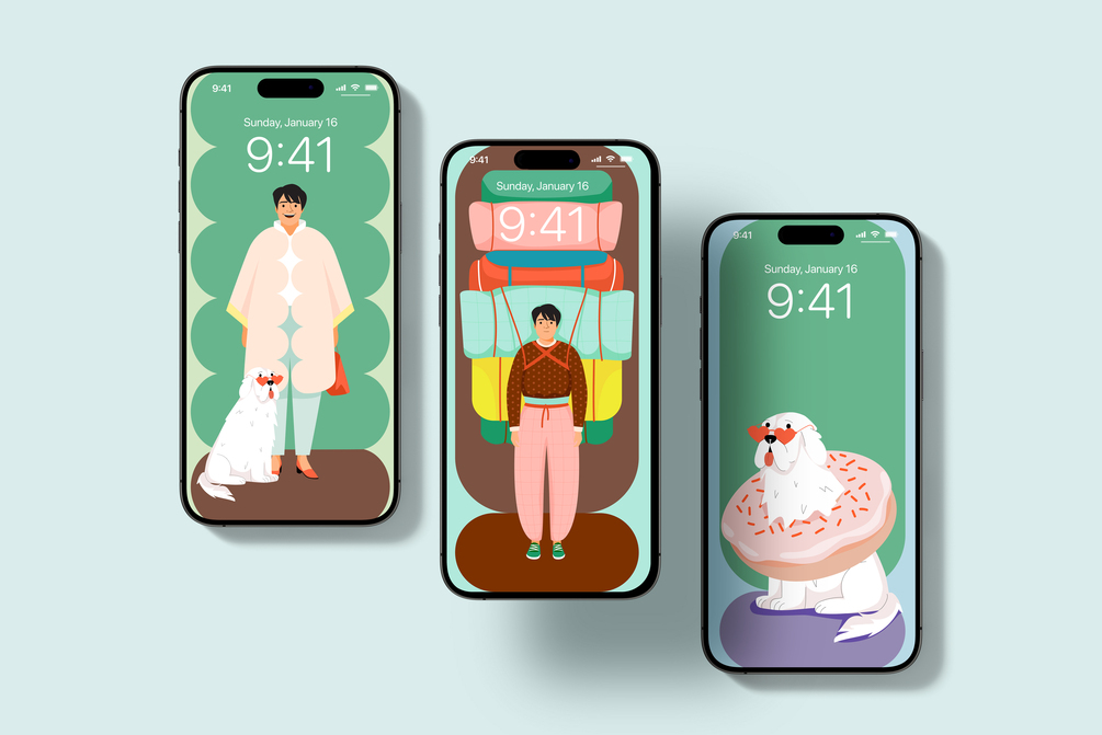 A collection of 3 High Definition Wallpapers featuring an illustrated design of characters - a woman traveller with her furry pet.